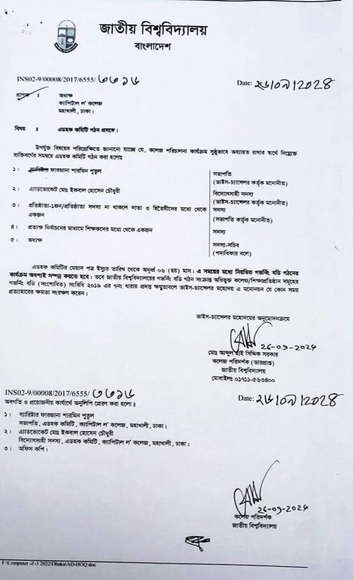 জাতীয় বিশ্ববিদ্যালয়ের রেজিস্ট্রার মো. আতাউর রহমান কর্তৃক স্বাক্ষরিত হয় এই কমিটি গত ২৬ সেপ্টেম্বর আনুষ্ঠানিকভাবে জারি করা হয়।