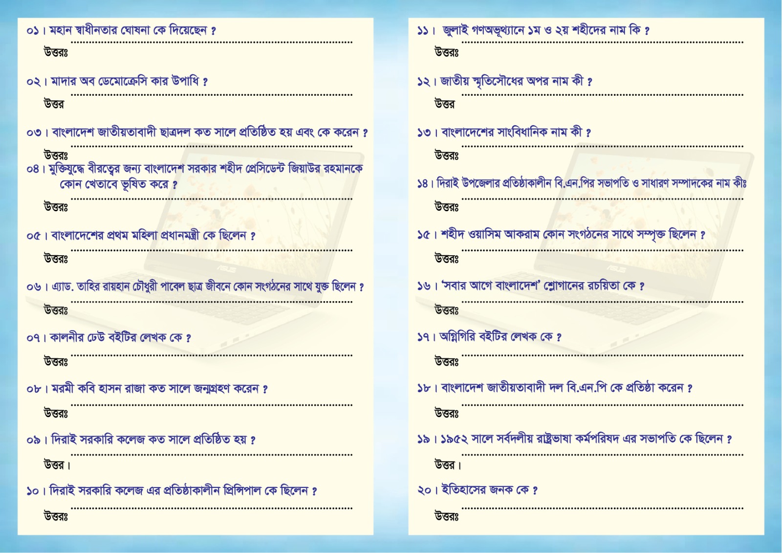 প্রশ্নগুলো বাংলাদেশের মুক্তিযুদ্ধ, জাতীয় ইতিহাস, সাহিত্য, রাজনীতি, বিজ্ঞান ও সাধারণ জ্ঞানভিত্তিক।