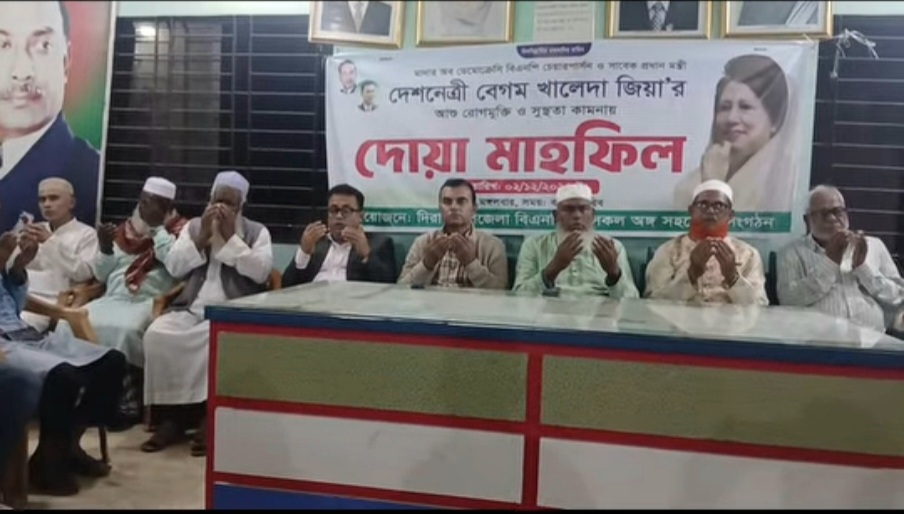 বাংলাদেশ জাতীয়তাবাদী দল-বিএনপির চেয়ারপারসন ও তিনবারের সাবেক প্রধানমন্ত্রী বেগম খালেদা জিয়ার দ্রুত সুস্থতা ও রোগমুক্তি কামনায় সুনামগঞ্জের দিরাইয়ে দোয়া মাহফিল