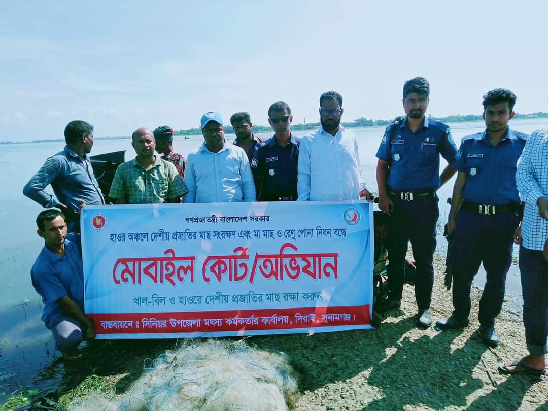 দিরাইয়ে ভ্রাম্যমাণ আদালতের অভিযানে অবৈধ কারেন্ট জাল জব্দ করে আগুনে পুড়িয়ে ধ্বংস করা হয়েছে। হাওর অঞ্চলে দেশীয় প্রজাতির মাছ সংরক্ষণ