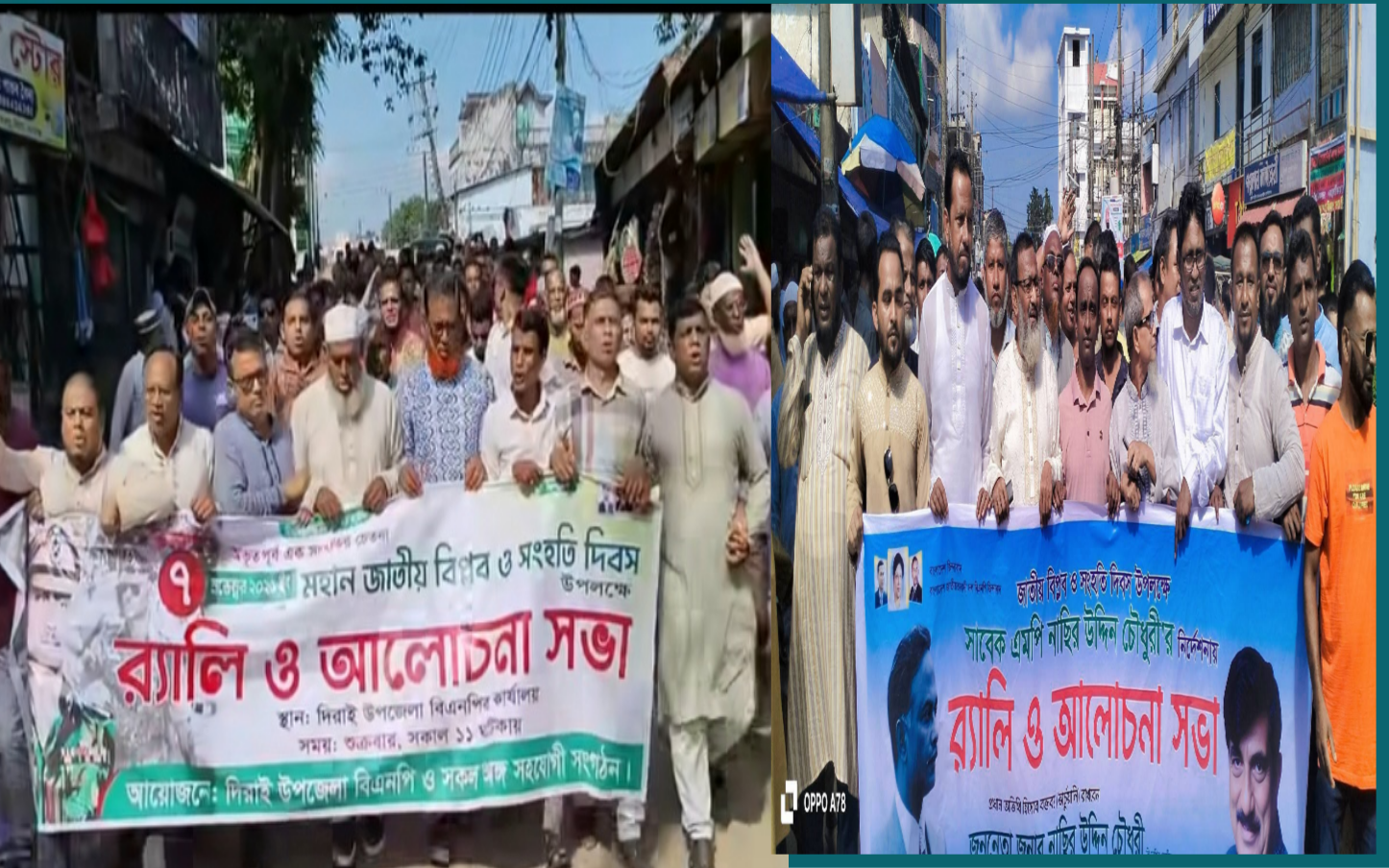 ৭ নভেম্বর ‘বিপ্লব ও সংহতি দিবস’ উপলক্ষে দিরাই উপজেলা বিএনপির উদ্যোগে পৃথকভাবে র্যালি ও আলোচনা সভা অনুষ্ঠিত হয়েছে। শুক্রবার (৭