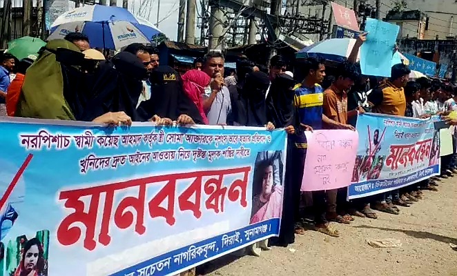 সুনামগঞ্জের দিরাইয়ে গৃহবধূ সোমা আক্তার হত্যার প্রতিবাদে ও খুনীদের দৃষ্টান্তমূলক শাস্তির দাবিতে মানববন্ধন করেছে নিহতের পরিবার ও স্থানীয় জনসাধারণ। মঙ্গলবার