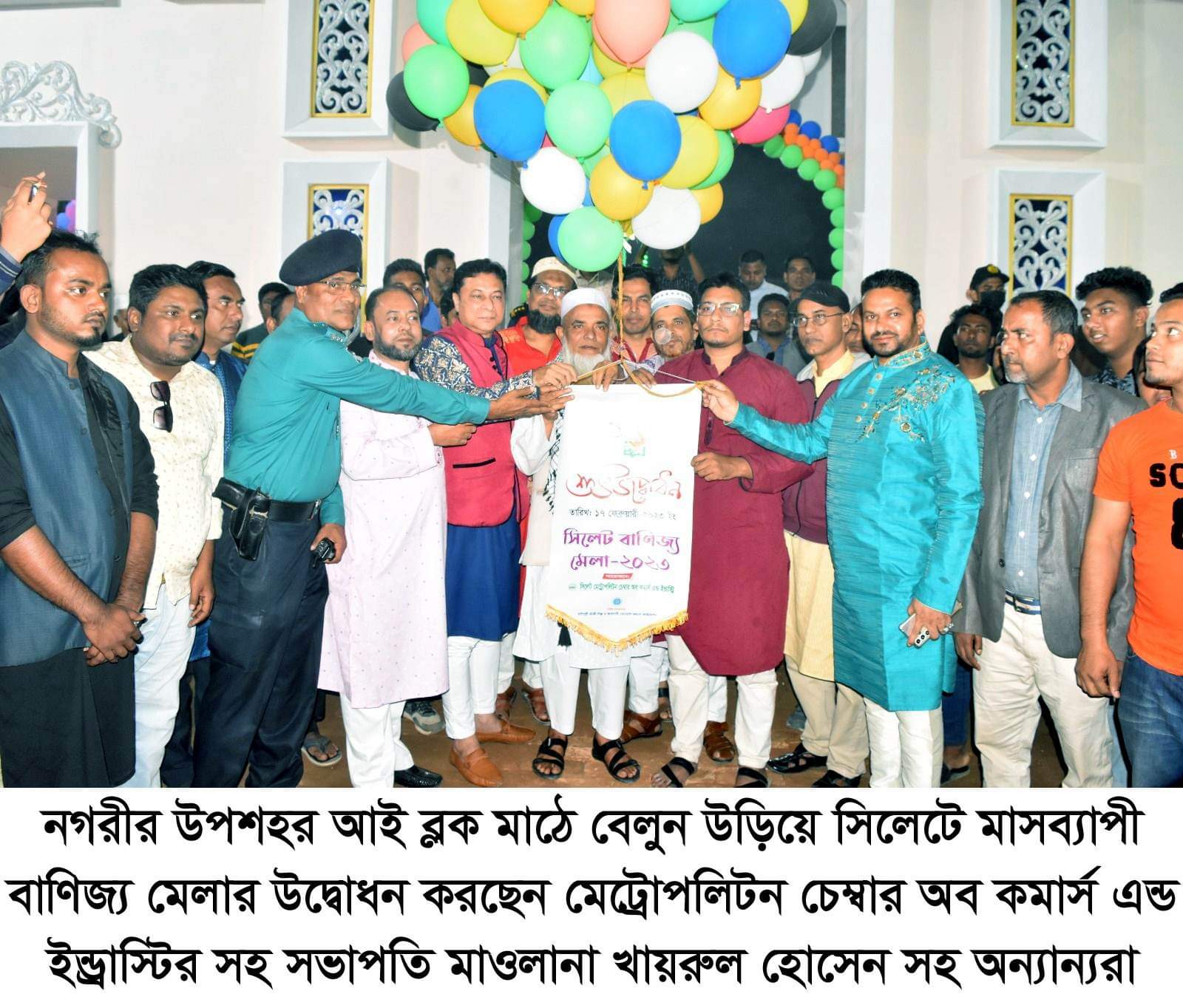 সিলেটে মাসব্যাপী বাণিজ্য মেলা বেলুন উড়িয়ে উদ্বোধন করা হয়েছে। শুক্রবার (১৭ ফেব্রুয়ারি) সিলেট নগরীর উপশহর আই ব্লক মাঠে বেলুন উড়িয়ে ও ফিতা কেটে উদ্বোধন করা হয় ।