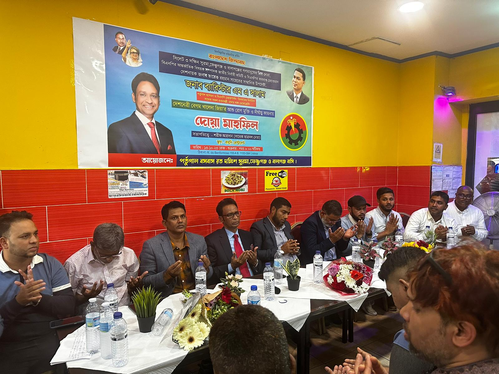 বিএনপির আন্তর্জাতিক বিষয়ক সম্পাদক জাতীয় নির্বাহী কমিটি ও বিএনপির ভারপ্রাপ্ত চেয়ারম্যান দেশনায়ক জনাব তারেক রহমানের উপদেষ্টা ব্যারিস্টার এম এ সালাম পর্তুগাল আগমন ও বিএনপি চেয়ারপার্সন তিনবারের নির্বাচিত সাবেক প্রধানমন্ত্রী মাদার অফ ডেমোক্রেসি দেশনেত্রী বেগম খালেদা জিয়া’র আশু রোগ মুক্তি ও দীর্ঘায়ু কামনায় এক দোয়া মাহফিলের আয়োজন করে দক্ষিন সুরমা,ফেঞ্চুগঞ্জ ও বালাগঞ্জের বিএনপি নেতাকর্মী।